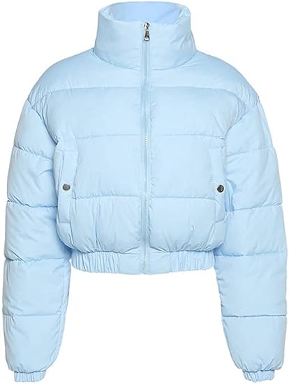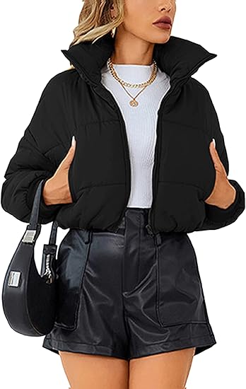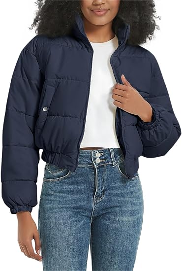Womens Casual Cropped Quilted Puffer Jacket Full Zip Stand Collar Outwear Coats